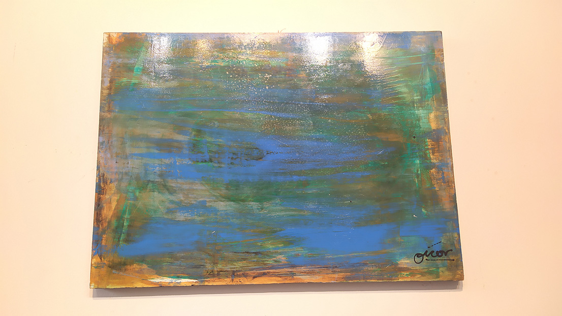 Estupenda pintura abstracta utilizando diferentes tipos de pinturas de gran calidad sobre chapón marino de cinco láminas.