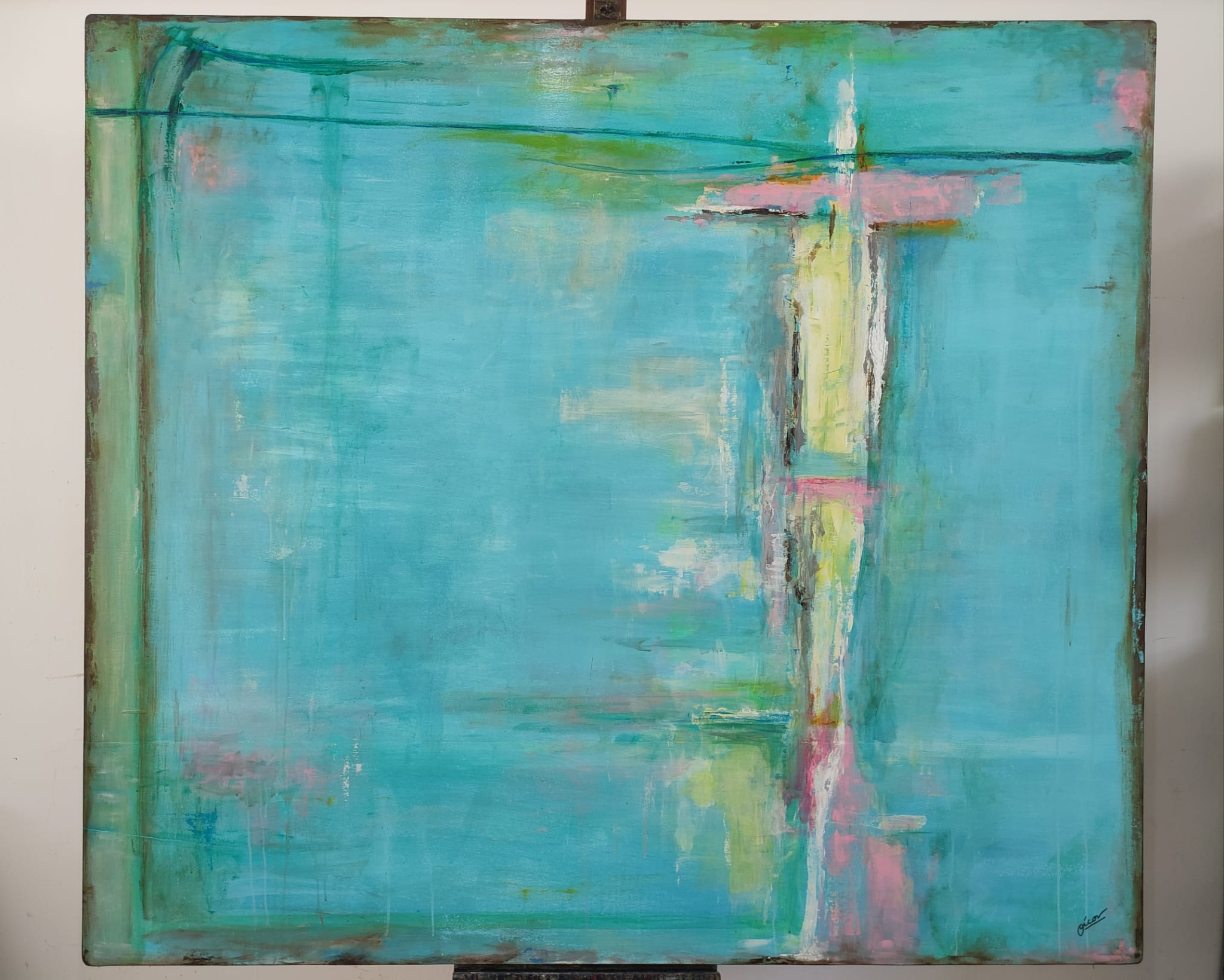 Tiene un premarco de madera de 4 cm de grosor para poder colgar, los marcos son muy personales y dependen mucho de la decoración de cada lugar. Esta pintura abstracta moderna está realizada a mano desde la elaboración del soporte hasta la terminación en laca de alta calidad.